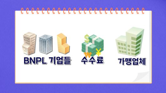 그렇다면 BNPL기업의 수익구조는 어떻게 될까요? 연회비도 없고, 할부 수수료도 없는데 어떻게 BNPL 서비스가 가능할 수 있을까요? BNPL의 결제 구조는 BNPL업체가 가맹점에 대금을 먼저 지불하고 소비자로부터 나중에 돈을 받는 구조입니다. 이때 BNPL업체는 가맹점으로부터 2.5~6%의 높은 가맹 수수료를 받습니다. 신용카드 업체가 가맹점에 요구하는 수수료가 통상 0.8~2.08% 수준인 것을 감안하면 3배에 달하는 높은 수준이죠.