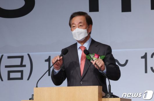 (서울=뉴스1) 박지혜 기자 = 김성태 국민의힘 선대위 직능총괄본부장이 26일 오전 서울 종로구 AW컨벤션센터에서 열린 제18대 대한노인회 김호일 회장 취임 1주년 기념식에서 윤석열 후보 대신 축사를 하고 있다. 2021.11.26/뉴스1 |