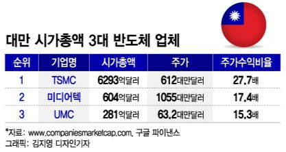 시가총액으로 본 대만 3대 반도체 업체는 TSMC, 미디어텍, UMC다. 세 업체 중에서도 지난 23일기준 TSMC의 시가총액이 6293억 달러(약 749조원)에 달할 정도로 크다. 미디어텍 시가총액은 604억 달러(약 72조원)을 기록했으며 우리나라 SK하이닉스(87조원)에 못 미친다. 역시 파운드리업체인 UMC 시가총액은 281억 달러(약 33조4400억원)다.