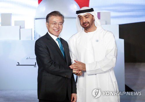 문재인 대통령은 2018년 3월 아랍에미리트(UAE)를 공식 방문, 무함마드 빈 자예드 알 나흐얀 왕세제와 함께 바라카 원전 1호기 건설 완료행사에 참석했다. [연합뉴스 자료사진] |