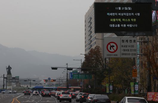 서울 지역에 미세먼지 비상저감조치가 발령된 지난 21일 오후 서울 종로구 세종대로사거리 인근 전광판에 시행 안내문이 표출되고 있다. [연합] |