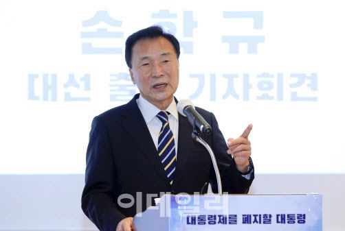 전날 무소속으로 대선 출사표를 던진 손 전 대표는 “사실 대선에 나오겠다고 생각한 것은 불과 1주일도 안 된다. ‘저거 미친놈 아니야, 대통령병이 도진 것 아니냐’ 등 비난과 중상모략, 조롱을 다 예상했다”며 “국민 통합의 대통령이 되겠다. 우리나라의 극단적인 분열과 갈등, 싸움의 정치를 끝내야 한다”며 대통령제 폐지를 공약으로 내세웠다.
