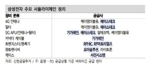 신한금융투자는 단기적 불확실성이 남아있는 만큼 단기적으로는 실적 가시성에, 중장기적으로는 성장성에 무게를 둔 접근이 유효하다고 조언했다. 최선호주로는 확정적 수주 잔고를 보유한 에치에프알(230240), 버라이즌향 공급이 가능한 RFHIC(218410), RF머티리얼즈, 일본향 공급이 시작되는 이노와이어리스(073490)를 꼽았다. 이어 차선호주로는 삼성전자 내 프로젝트를 가장 많이 참여한 기가레인(049080)을 제시했다.