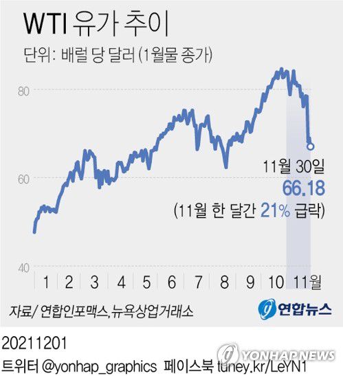 이에 따라 WTI는 11월 한 달간 21% 가까이 떨어졌고 브렌트유도 16% 내려 지난해 3월 이후 가장 큰 폭의 월간 하락률을 기록했다.
