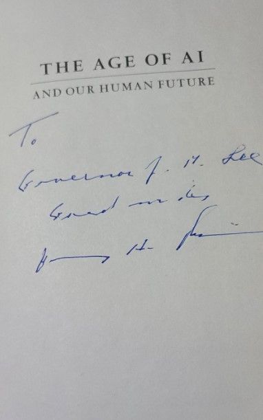 키신저 전 장관은 최근 에릭 슈밋 전 구글 CEO, 컴퓨터과학자인 대니얼 후텐로슈 MIT 교수와 공동으로 신간 ‘인공지능시대(The Age of A.I.)’를 발간하면서 미-중 관계가 상호 불신에서 실제적 충돌 단계로 치닫고 있어 지극히 위태로운 상황이라고 진단했다. 이 책에서 그는 미-중 적대감이 외교·안보·경제 등 전통적 영역에서 AI 첨단 무기 개발 등으로까지 확대된 현 상황을 제1차 세계대전 전야에 비유했다. 파국을 막으려면 미-중이 대화로 불확실성을 해소해야 한다는 제언이다. 키신저 전 장관은 이 책에 이 후보에게 보내는 친필 사인은 적었다.