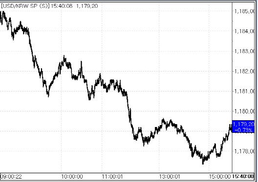 1일 서울외국환중개에 따르면 환율은 전 거래일 종가(1187.90원) 대비 8.70원 하락한 1179.20원에 마감했다. 지난 10월 19일(8.90원) 이후 최대 하락 기록이다. 장중엔 10원 넘게 빠지면서 한 때 1177.30원까지 떨어졌으나 마감 직전 하락폭을 일부 반납하며 마무리했다.