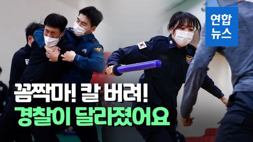 (서울=연합뉴스) "대상자가 칼을 들었어요. 어떻게 해야 하죠? 대응해야죠. '칼 버려' 하고 외치면서 삼단봉을 좌우로 마구 흔들어요. 오른발 앞 하단을 치세요!"