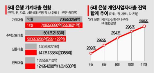 자영업자가 대부분인 개인사업자들의 대출도 300조원에 육박했다. 이들 은행의 같은기간 개인사업자대출 잔액은 298조7476억원으로 전월(296조7467억원)보다 2조9억원 늘었다. 하반기 흐름에 견줘볼 때 지난달 말 잔액이 특별히 더 크게 증가한 건 아니지만 매달 2조원 넘게 늘어나는 추세가 이어지고 있다는 점에서 눈여겨볼 필요가 있다는 지적이다.