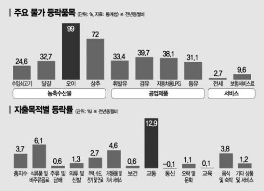 품목별로는 지난달 석유류 물가가 일년 전보다 무려 35.5% 뛰었다. 2008년 7월(35.5%) 이후 13년4개월 만에 가장 큰 상승폭이다. 또 농축수산물 물가는 같은 기간 7.6% 올랐고, 외식 등 개인서비스 물가도 3.0% 상승했다. 이 세 품목이 전체 물가상승에 미친 기여도만 78.7%에 이른다.