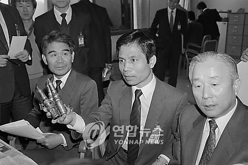 1989년 조비오 신부 고발 방침 기자회견 참석한 송진원 전 준장(오른쪽) |