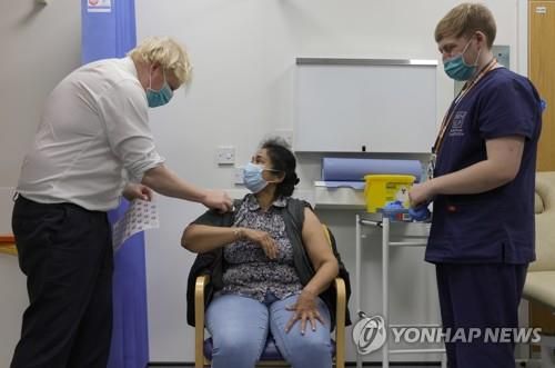 코로나 부스터샷 접종자 격려하는 존슨 영국 총리 |