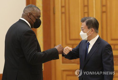 로이드 오스틴 미 국방부 장관과 인사하는 문재인 대통령 |