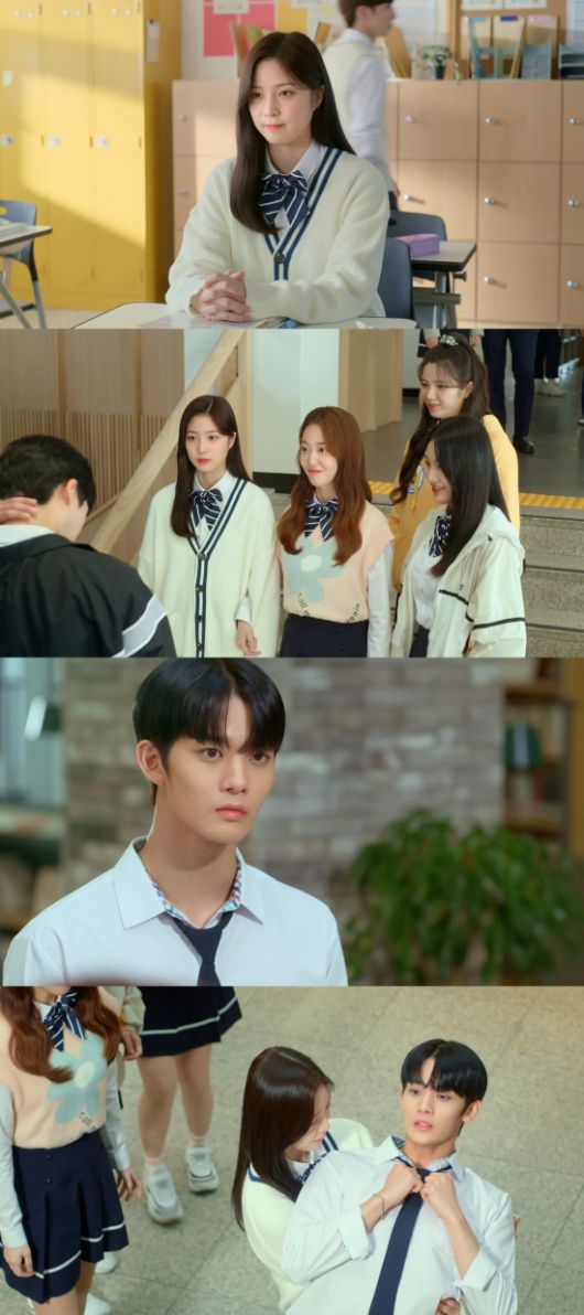 먼저 주변에 친구들 없이 혼자 앉아 있는 유민재가 눈길을 끈다. 우정고등학교 교복을 입고 있는 유민재는 두 손을 마주 잡은 채 굳은 결심을 한 듯한 표정이다. 유민재에게 팔짱을 끼고 있는 정현지(한지완 분)과 김다예(김나영 분), 이은지(유혜진 분)의 스틸컷도 공개됐다. 앞에 서 있는 남자를 보고 굳은 표정의 유민재와 밝게 웃고 있는 정현지, 김다예, 이은지. 상반된 이들의 표정은 호기심을 자극한다.