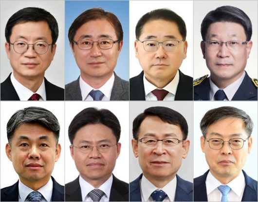 문재인 대통령이 3일 차관급 8개 직위에 대한 인사를 단행했다. 왼쪽 위에서부터 시계방향으로 신임 김현환 문화체육관광부 제1차관, 오영우 문화체육관광부 제2차관, 김종훈 농림축산식품부 차관, 이흥교 소방청장, 박병홍 농촌진흥청장, 정봉훈 해양경찰청장, 유국희 원자력안전위원회 위원장, 김창수 민주평화통일자문회의 사무처장. /청와대 제공 |