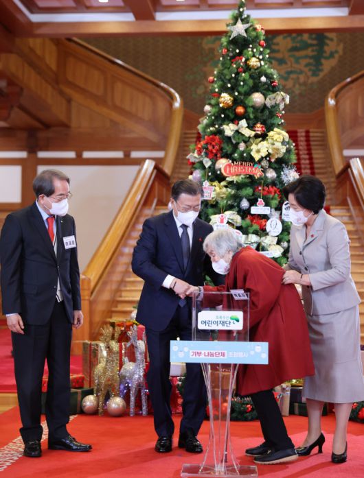 문 대통령은 이날 연말을 맞아 국내 주요 기부금품 모집 및 나눔 단체를 청와대로 초청해 “작년과 올해, 예고없이 찾아온 코로나19로 특히 어려웠을 텐데 국민의 나눔의 정신을 현장에서 모으고 전달하기 위해 애쓰신 여러분들이 자랑스럽다”며 격려하며 이같이 말했다.
