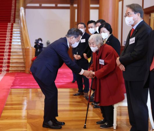 [서울=뉴시스] 김진아 기자 = 문재인 대통령이 3일 오전 청와대에서 열린 '2021 기부·나눔단체 초청행사'에 참석, 김밥 장사로 모은 전 재산을 기부하고 40년간 장애인 봉사활동을 한 초록우산어린이재단 기부자인 박춘자 할머니와 인사를 하고 있다. 2021.12.03. |