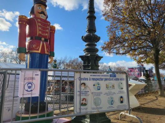 2일(현지시간) 프랑스 파리 튈르리 정원 앞에 크리스마스 마켓 안에서는 마스크를 반드시 착용해야 한다는 안내문이 붙어있다. <사진=연합뉴스> |