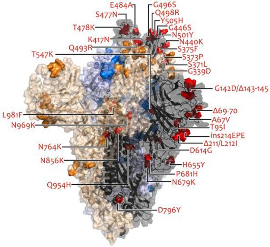 공개된 이미지의 우측 하단 네다섯시 방향에는 바이러스가 더욱더 쉽게 인체 안으로 들어가도록 돕는 ‘H655Y’와 ‘P681H’ 그리고 ‘N679K’라는 약자로 표기된 세 가지 돌연변이가 존재한다. 이미지는 또 항체를 회피할 수 있는 돌연변이 그룹인 K417N, S477N, Q498R, E484A, N501Y의 모습도 보여준다.
