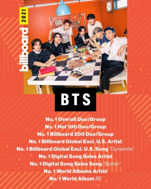 또 방탄소년단의 ‘다이너마이트’(Dynamite)는 빌보드 글로벌(미국곡 제외)에서, ‘버터’는 디지털 세일즈에서 각각 정상을 차지한 노래로 기록됐다.