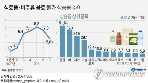 (세종=연합뉴스) 김다혜 기자 = 우리나라 식료품 및 비주류음료 물가가 3분기(7∼9월)에 지난해 같은 기간보다 5.0% 올라 경제협력개발기구(OECD) 회원국 중 다섯 번째로 높은 상승률을 기록한 것으로 나타났다.