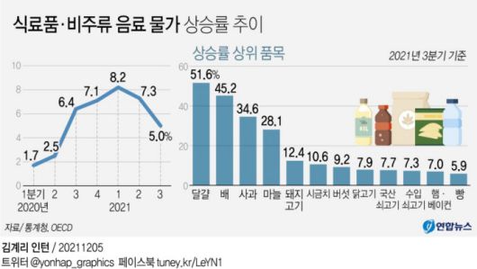 한국의 지난 3분기 식료품 및 비주류음료 물가가 지난해 같은 기간 대비 5.0% 올라 경제협력개발기구(OECD) 회원국 중 다섯 번째로 높은 상승률을 기록했다. 특히 지난달에는 전년 대비 6.1% 급등한 것으로 나타났다. 밥상물가로 불리는 식료품과 비주류음료는 물가가 올라도 절약하기 어렵고 구매 빈도도 높은 만큼 소비자들이 느끼는 물가 부담은 그만큼 더 커진다.