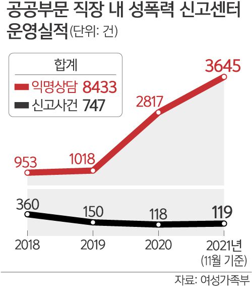 반면 직장 내 성폭력과 관련해 실제로 신고센터에 신고하는 사례는 줄어든 것으로 나타났다. 신고 건수는 2018년 360건, 2019년 150건, 지난해 118건 등 감소세가 뚜렷하다. 이에 대해 여가부 관계자는 “공공부문 신고센터가 처음 문을 연 2018년에는 과거 발생한 사건들이나 동일 사건에 대한 중복 신고가 많았다”며 “성폭력 관련 법 제도가 강화되면서 각 직장 내 신고센터가 활성화됐고, 분야별 신고센터도 추가 운영되면서 신고 건수가 분산된 것으로 보인다”고 설명했다.