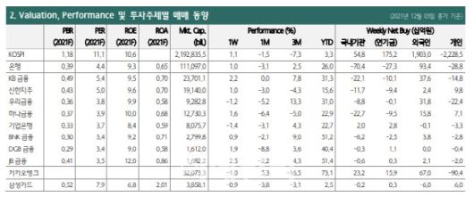 지난주 은행주는 1.0% 상승하며 코스피 상승률과 비슷한 수준을 보였다. 오미크론 불확실성으로 주초 급락세를 보였지만 후반 급등하며 주간 단위로는 상승 마감한 것이다.
