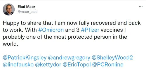오미크론 변이에 감염됐던 이스라엘 의사 엘라드 마오르가 트위터에 회복과 업무복귀 소식을 전했다. [트위터 캡처. 재판매 및 DB 금지] |