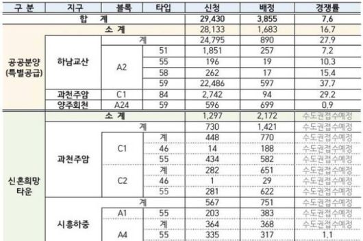과천 주암 지구 공공분양 특별공급의 경우 94가구(전용 84㎡) 모집에 2742명이 신청해 29.2대 1의 경쟁률을 기록한 것과 온도차가 극명하다.