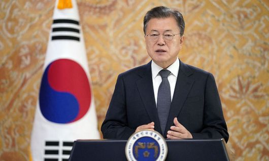 문재인 대통령이 7일 서울에서 열린 ‘2021 서울 유엔 평화 유지 장관회의 개회식’에 영상을 통해 축사를 전하고 있다. 청와대 제공 |