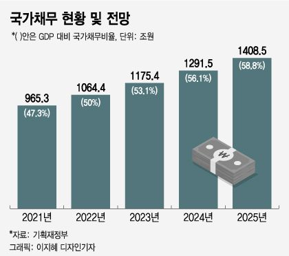 당초 정부는 내년 말에는 국가채무가 1064조4000억원을 기록해 처음으로 1000조원을 돌파하고, GDP 대비 국가채무비율이 50%를 기록할 것으로 내다봤다. 이런 상황에서 국채를 대거 발행해 추경을 편성한다면 내년 GDP 대비 국가채무비율은 정부의 전망치인 50%를 훌쩍 넘어서게 된다.