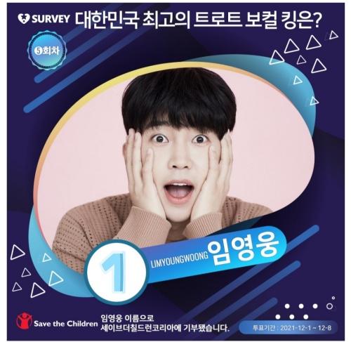 '트로트 남자 부문 '5회' 대한민국 최고의 트로트 보컬 킹?'이란 테마로 진행된 스타서베이 투표에서 임영웅은 총 투표수 11,777,270표 중 43.70%인 5,142,980표를 얻어 1위에 랭크됐다.