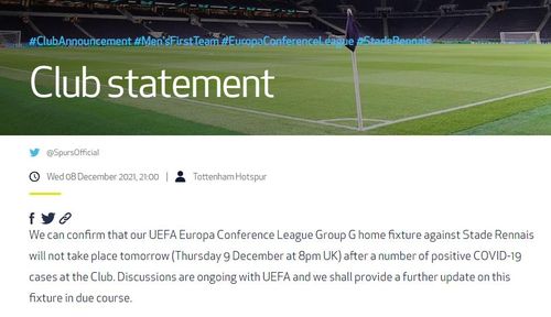토트넘은 9일(한국시간) "클럽 내 다수 코로나19 양성 사례가 나옴에 따라 내일 예정된 스타드 렌(프랑스)과의 콘퍼런스리그 홈 경기는 열리지 않는다"며 "UEFA와 논의를 진행 중이다. 후속 사항은 추후 발표할 것"이라고 발표했다.