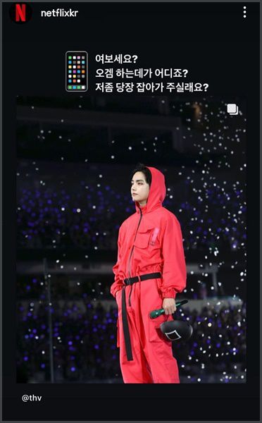 어제(8일) 뷔는 자신의 인스타그램을 통해 미국 콘서트에서 넷플릭스 드라마 '오징어 게임' 진행 요원으로 변신했던 모습을 공개했습니다. 팬들의 반응은 뜨거웠고, 넷플릭스 측도 공식 인스타그램에 뷔의 해당 사진을 올리며 "여보세요? 오징어 게임 하는 데가 어디죠? 저 좀 당장 잡아가 주실래요?"라는 재치 있는 멘트를 남겼습니다.