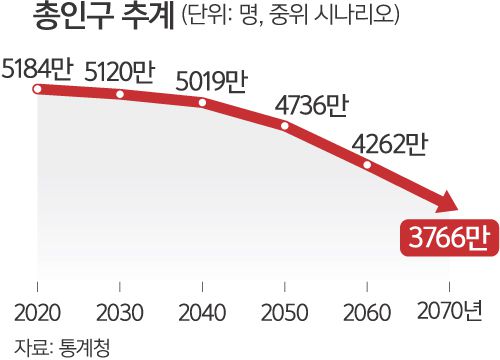 특히 우리나라 인구는 지난해 정점을 찍은 뒤 향후 10년간 6만명 내외로 감소해 2030년 5120만명으로 줄어들 것으로 보인다. 이 같은 감소세는 더욱 빨라져 2040년에는 5019만명, 2050년 4736만명, 2060년 4262만명, 2070년 3766만명까지 감소할 전망이다.