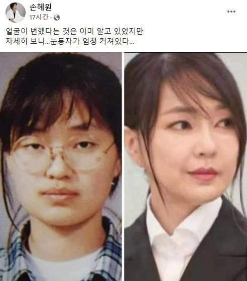 9일 손 전 의원은 페이스북에 윤 후보의 아내 김씨의 과거 사진을 올리고 “얼굴이 변했다는 것은 이미 알고 있었다”며 “자세히 보니 눈동자가 엄청 커져있다”는 글을 남겼다.