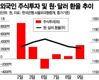 오창섭 현대차증권 연구원은 "여러 요인이 있겠지만 외국인이 4주 연속 국내 주식 순매수를 한 것도 수급적 측면에서 환율 상승을 막는 요인으로 작용했다"고 밝혔다.