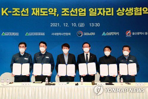 고용노동부, 울산시, 동구, 현대중공업, 현대미포조선, 두 조선사 사내협력사연합회는 10일 오후 현대중공업 회의실에서 'K-조선 재도약, 조선업 일자리 상생협약'을 체결했다.