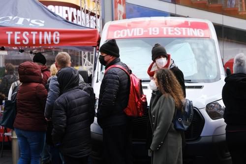 미국 뉴욕 타임스스퀘어의 코로나19 검사소에 줄 선 사람들 |