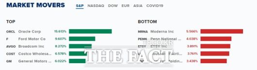 종목별로로는 오라클 주가는 실적이 예상치를 웃돌았다는 소식에 15.6% 상승했고.시스코시스템스가 2.95% 올랐고 애플과 마이크로소프트는 각각 2.8%, 2.83% 상승했다. 일론 머스카가 주식을 팔아치운 테슬라도 1.31% 올랐다