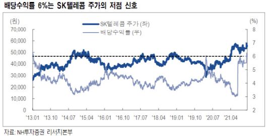 다만 확실한 주가 상승 모멘텀은 보유하고 있다고 봤다. 안 연구원은 “2022년 SK텔레콤의 주당배당금을 3400원(분기배당 850원)으로 예상한다”며 “배당수익률 6.1% 수준으로, SK텔레콤의 주가는 지난 수년간 배당수익률 6%를 기점으로 반등하는 모습을 보였고, 2022년 양호한 실적이 예상되는 만큼, 분할 거래 재개 이후 부진했던 주가 흐름은 안정기에 접어들 것”이라고 했다.