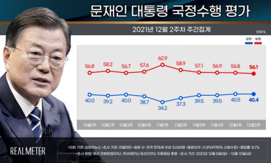 여론조사 전문기관 리얼미터가 오마이뉴스 의뢰로 지난달 29일부터 지난 3일까지 전국 만 18세 이상 유권자 3043명을 상대로 실시한 설문조사 결과(표본오차 ±1.8%포인트 신뢰수준 95%) 문 대통령의 국정수행 긍정평가는 지난주 대비 0.1%포인트 낮아진 40.4%(매우 잘함 22.6%, 잘하는 편 17.8%)로 나타났다.