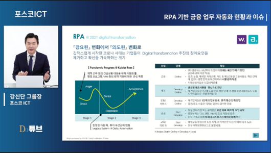 강신단 포스코ICT 그룹장은 <디지털데일리> 주최로 지난 6일부터 10일까지 5일간 웨비나 플랫폼 'DD튜브'를 통해 개최된 [2022년 전망, 금융IT Innovation 버추얼 컨퍼런스]에서 RPA에 기반한 금융 업무 자동화의 현황을 소개했다.