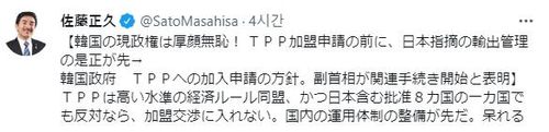 사토 회장은 이날 자신의 트위터 계정에 "한국의 현 정권은 후안무치"라며 "TPP(CPTPP의 이전 명칭) 가입 신청 전에 일본이 지적한 수출관리 시정이 우선"이라고 적었다.