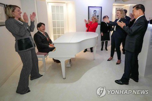일본 외무상 피아노 연주에 박수치는 정의용 외교장관 |