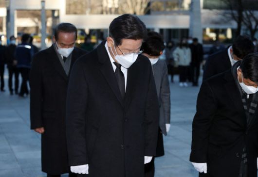이재명 더불어민주당 대선 후보가 13일 오후 경북 포항시 포스텍 내 노벨동산에 있는 고 박태준 명예회장의 동상을 찾아 추모하고 있다. (사진=연합뉴스) |