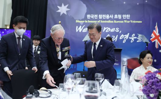 ,다음으로 만찬을 앞두고 이안 크로포드 제독과 콜린 칸 장군의 건배제의가 있었다. 크로포드 제독은 "우리는 우리에게 주어진 많은 관심과 애정에 큰 기쁨 누렸다"면서 '지속되는 양국의 국민들의 우정을 위하여'라며 건배제의를 했다. 이안 크로포드 제독은 극동해군으로 한국 전쟁에 참전 후 전역하여 현재 한국전 참전용사 협회장으로 활동 중이다. 콜린 칸 장군은 ". 대통령님, 호주에서 방한 길지 않지만 분명 호주 우의 우애, 양국의 좋은 관계 느꼈을 것"이라며 "참전용사 대표하여 방문해 주셔서 대단히 감사하다는 말씀 드린다"고 말했다. 콜린 칸 장군은 한국 전쟁에서 총상을 입고 전역 후 6.25전쟁과 한국의 발전상을 알리며 한-호 우호 증진에 힘쓴 공로로 지난 7월 대한민국 정부로부터 국민훈장 석류장을 수여받았다.