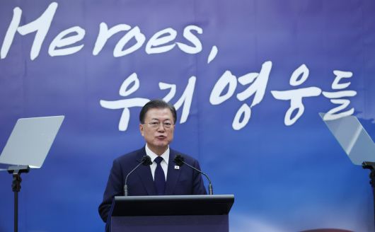 호주를 국빈 방문 중인 문재인 대통령이 13일 캔버라 시내 한 호텔에서 열린 한국전 참전용사 초청 만찬에서 인사말을 하고 있는 모습. /연합뉴스 |