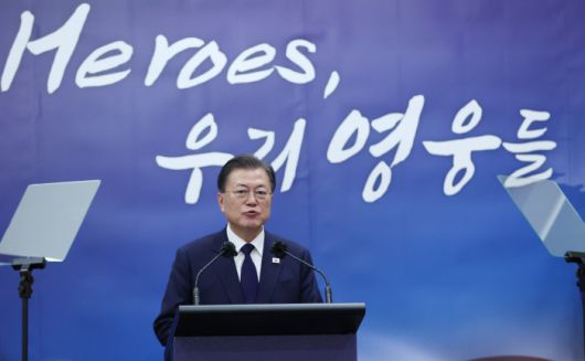 호주를 국빈 방문 중인 문재인 대통령이 13일 캔버라 시내 한 호텔에서 열린 한국전 참전용사 초청 만찬에서 인사말을 하고 있다. 연합뉴스 |