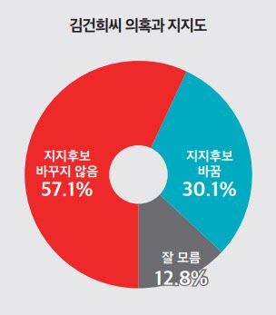 “지지후보를 바꾼다”고 응답한 비중은 30.1%, “잘 모르겠다”고 답한 비중은 12.8%였다.